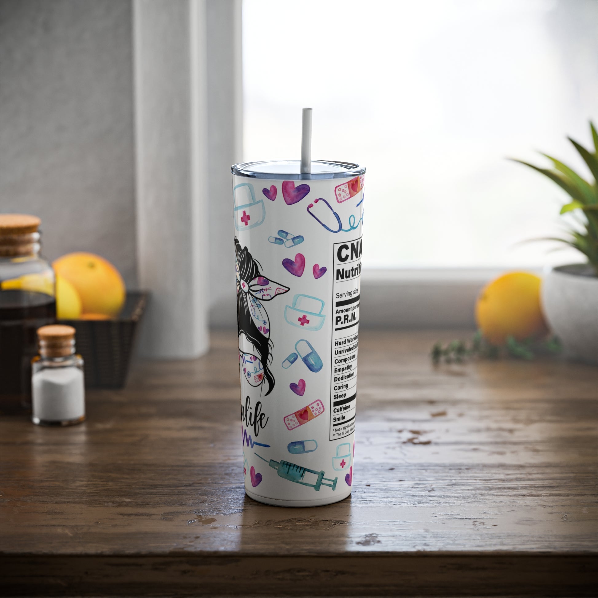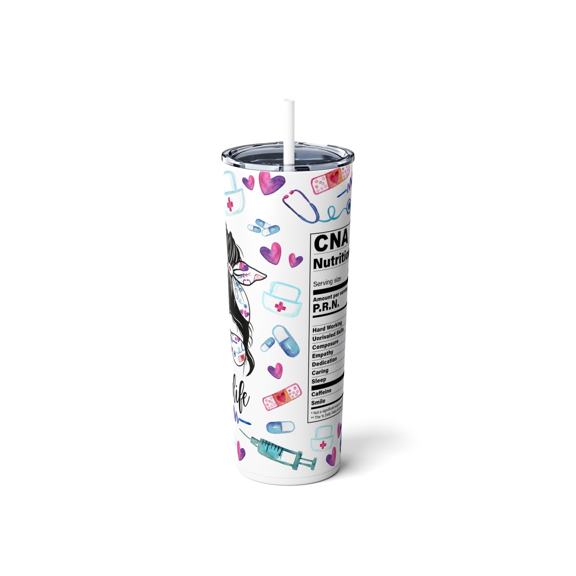 Embrace the CNA Life with a touch of humor and style. Order your CNA Life Nutrition Facts Mom Bun Hair 20 oz Skinny Tumbler today and enjoy your favorite beverages in a tumbler that celebrates your amazing multitasking abilities as a CNA and a supermom.